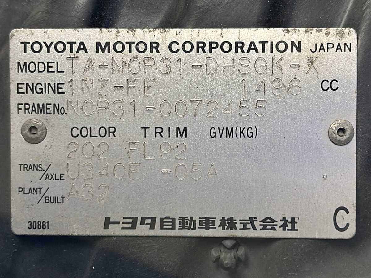 | Model Code | TA-NCP31 | VIN | NCP31-0072455 |